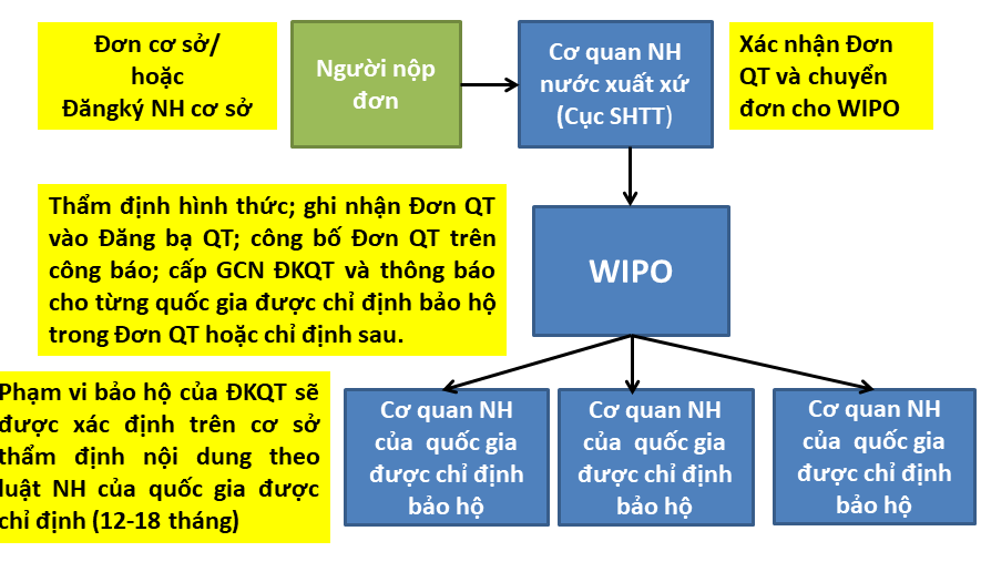 Cá nhân là công dân hoặc cư trú tại lãnh thổ của bên tham gia hoặc pháp nhân có cơ sở kinh doanh hoạt động thực thụ tại lãnh thổ bên tham gia có quyền nộp đơn đăng ký quốc tế nhãn hiệu theo hệ thống Madrid. Theo quy định, đơn đăng ký quốc tế nhãn hiệu có thể được soạn thảo bằng một trong ba ngôn ngữ tiếng Anh, tiếng Pháp hoặc tiếng Tây Ban Nha (Việt Nam tuyên bố sử dụng hai ngôn ngữ tiếng Anh và tiếng Pháp). Dựa trên một đơn cơ sở hoặc một đăng ký cơ sở, người nộp đơn sẽ nộp một đơn đăng ký quốc tế tại nước xuất xứ sau đó sẽ được chuyển cho Văn phòng quốc tế của WIPO. Tại đây đơn đăng ký sẽ được thẩm định về mặt hình thức, bao gồm tư cách người nộp đơn, mẫu nhãn hiệu, danh mục sản phẩm/dịch vụ… Trong trường hợp đáp ứng đầy đủ các yêu cầu, đơn đăng ký quốc tế sẽ được ghi nhận trong đăng bạ quốc tế và được công bố trong công báo nhãn hiệu quốc tế của WIPO. Văn phòng quốc tế thông báo cho từng bên tham gia nhận được yêu cầu bảo hộ trong đơn quốc tế hoặc chỉ định sau. Từ ngày đăng ký quốc tế hoặc chỉ định sau, việc bảo hộ nhãn hiệu tại từng bên tham gia được chỉ định sẽ giống như khi nhãn hiệu đó được nộp trực tiếp tại Cơ quan của bên tham gia đó. Mỗi bên tham gia được chỉ định thẩm định nội dung đơn trong khoảng thời gian quy định theo Thỏa ước hoặc Nghị định thư và sau đó thông báo kết quả cho Văn phòng quốc tế.